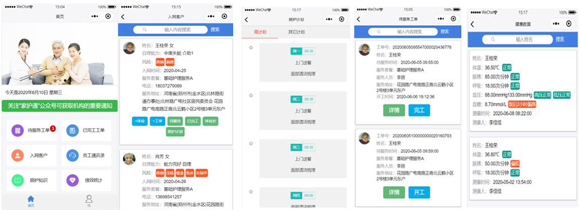 養(yǎng)老服務(wù)企業(yè)針對(duì)部分有特殊需求的老年人上門提供"準(zhǔn)"養(yǎng)老院的生活照料服務(wù)、護(hù)理服務(wù)和醫(yī)療服務(wù)等,還可以在老人家中安裝物聯(lián)網(wǎng)環(huán)境監(jiān)測探頭、智能健康監(jiān)測設(shè)備等,對(duì)居家老人進(jìn)行24小時(shí)安全自動(dòng)值守。服務(wù)企業(yè)通過"居家照護(hù)運(yùn)營管理系統(tǒng)"對(duì)機(jī)構(gòu)客戶、員工、服務(wù)進(jìn)行管理,老人家屬通過"家護(hù)通"接收?qǐng)?bào)警信息。